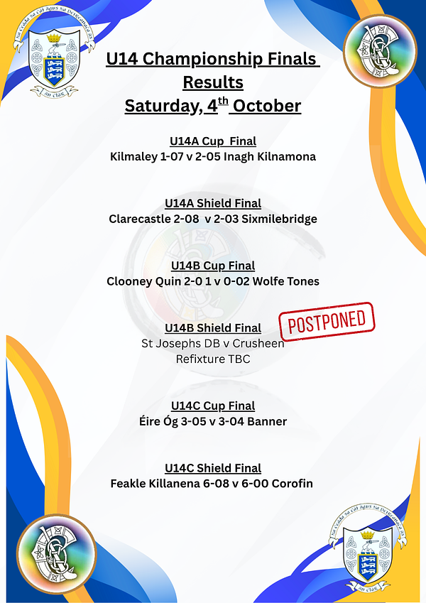 See time change for under 14A final 3:30 in Kilnamona See poster for some changes due to ...