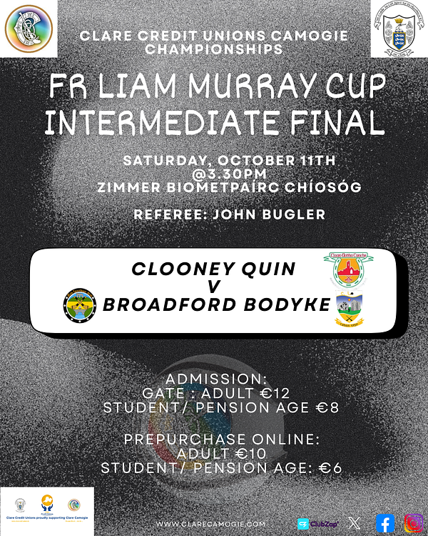 Ahead of the Cup Final, Ruan and Sixmilebridge will battle it out for intermediate shield honours. Throw in at Fr. McNamara Park is at 12.45, leaving plenty time to get to Páirc Chíosóg.